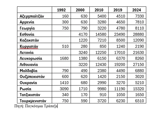 Η διάλυση της ΕΣΣΔ ωφέλησε σε σημαντικό βαθμό τις δημοκρατίες που απομακρύνθηκαν από την Ρωσική επιρροή. Το πιο χαρακτηριστικό παράδειγμα είναι οι χώρες της Βαλτικής, οι οποίες, μετά την είσοδο τους στην ΕΕ το 2004, γνώρισαν εκρηκτική οικονομική ανάπτυξη, με κατά κεφαλήν εισόδημα αναπτυγμένης πλέον χώρας, όπως φαίνεται στον πίνακα. Οι χώρες της ανατολικής τέως ΕΣΣΔ αναπτύχθηκαν επίσης με γρήγορο ρυθμό, κυρίως λόγω της συνεργασίας τους με την Κίνα. Αντίθετα, η Ρωσική Ομοσπονδία αναπτύχθηκε κυρίως μέσω της εκμετάλλευσης των φυσικών της πόρων όπως πετρέλαιο, φυσικό αέριο και μεταλλεύματα, το μοντέλο της εποχής Μπρέζνιεφ! Για τον λόγο αυτό, το κατά κεφαλήν εισόδημα της εξαρτάται αποκλειστικά από τις τιμές των πόρων αυτών στις αγορές. Το ίδιο ισχύει και με την Λευκορωσία, χώρα πλήρως συνδεδεμένη, έως και υποτελής, με την Ρωσία. Η Ρωσία πλέον απομυζά τις πλούσιες σε πόρους περιοχές της Σιβηρίας που είναι μέλη της Ρωσικής Ομοσπονδίας!