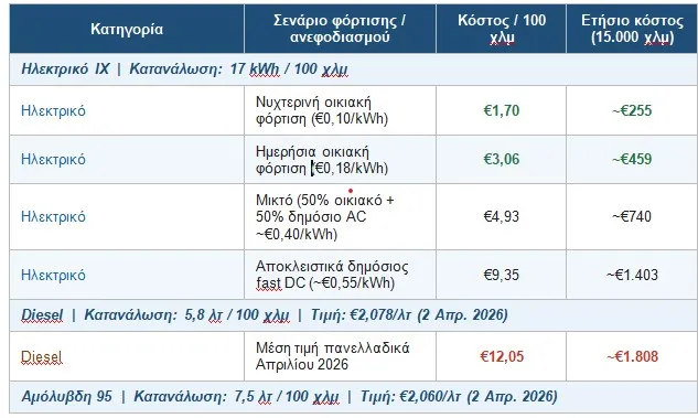 Πηγές: Παρατηρητήριο Τιμών Υγρών Καυσίμων (fuelprices.gr), Τιμές ηλεκτρικών παρόχων. Παραδοχές: μεσαίο αστικό sedan όχημα, τυπική οδήγηση.