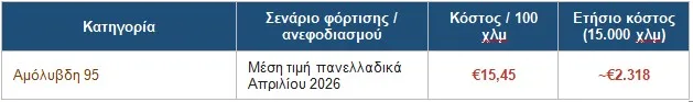Πίνακας 1: Συγκριτικό κόστος χρήσης ανά τεχνολογία πρόωσης (Απρίλιος 2026)