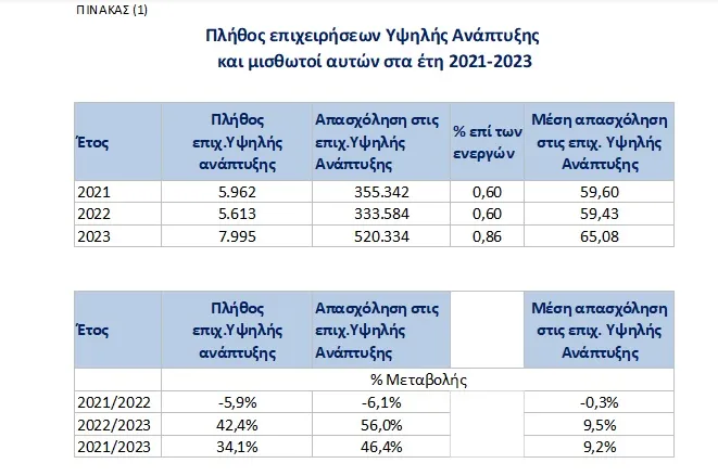 Σύμφωνα με τα στοιχεία του πίνακα (1) φαίνεται ότι οι επιχειρήσεις υψηλής ανάπτυξης αυξήθηκαν σημαντικά στη χώρα μας την περίοδο 2021–2023, από 5.962 το 2021, το 2023 φθάνουν τις 7.995, δηλαδή σημειώθηκε μία αύξηση 34,01%.