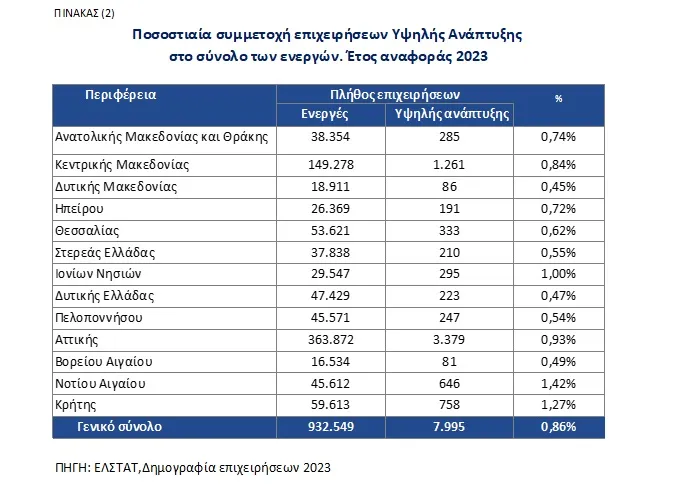 Οι επιχειρήσεις υψηλής ανάπτυξης κατά περιφέρεια