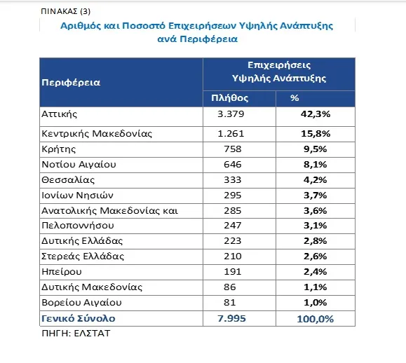 Από τον πίνακα (3) φαίνεται ότι οι δύο μεγάλες περιφέρειες Αττικής και Κεντρικής Μακεδονίας έχουν τον μεγαλύτερο αριθμό των επιχειρήσεων υψηλής ανάπτυξης. Πιο συγκεκριμένα, από τις 7.995 επιχειρήσεις που βρέθηκαν το 2023, οι 3.379 είναι στην περιφέρεια Αττικής, και οι 1261 στην περιφέρεια Κεντρικής Μακεδονίας.
