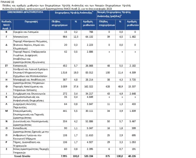 Στον πίνακα (4) παρουσιάζονται οι επιχειρήσεις υψηλής ανάπτυξης ανά οικονομική δραστηριότητα (κωδικός NACE της ΕΛΣΤΑΤ). Από την ανάγνωση του σχετικού πίνακα φαίνεται ότι τα μεγαλύτερα ποσοστά συγκεντρώνονται σε: