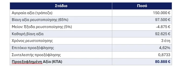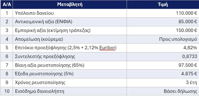 Δανειολήπτης με υπόλοιπο 110.000€. Η τράπεζα δηλώνει εμπορική αξία 150.000€, η αντικειμενική είναι 85.000€. Προσέξτε την απόκλιση: