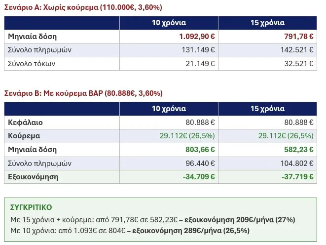 Η τράπεζα θα εισέπραττε 80.888€ από 110.000€ – ζημία 29.112€ (26,5%). Αυτό είναι η βάση του δυνητικού κουρέματος.