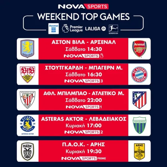 Η Stoiximan Super League, συνεχίζεται με την 13η αγωνιστική και το «El Clasico» της Θεσσαλονίκης, ΠΑΟΚ – Άρης (7/12, 19:30) που θα μεταδοθεί στα κανάλια Novasports όπως και οι αγώνες Asteras AKTOR – Λεβαδειακός (7/12, 17:00) και Πανσερραϊκός – Παναιτωλικός (8/12, 18:00). Στα κανάλια Cosmote Sport θα μεταδοθούν οι αναμετρήσεις Ολυμπιακός – ΟΦΗ (6/12, 17:00), Βόλος ΝΠΣ – Κηφισιά (6/12, 20:30), ΑΕΛ Novibet – Παναθηναϊκός (7/12, 17:30), ΑΕΚ – Ατρόμητος (7/12, 21:00). Οι αγώνες του ελληνικού πρωταθλήματος θα πλαισιωθούν στο Novasports με την αγαπημένη εκπομπή των φιλάθλων «Η Ώρα των Πρωταθλητών» με τους Γιαννίκο Δούσκα, Λίλα Κουντουριώτη, Αποστόλη Λάμπο, καθώς και με την εκπομπή «Monday Football Club» με τους Γιάννη Πάγκο και Ντέμη Νικολαΐδη.