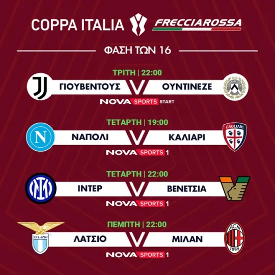 Το Coppa Italia έχει φουλ δράση στα κανάλια Novasports με τους αγώνες για τη φάση των «16» και οι συνδρομητές θα απολαύσουν Γιουβέντους – Ουντινέζε (2/12, 22:00), Αταλάντα – Τζένοα (3/12, 16:00), Νάπολι – Κάλιαρι (3/12, 19:00), Ίντερ – Βενέτσια (3/12, 22:00), Μπολόνια – Πάρμα (4/12, 19:00) και Λάτσιο – Μίλαν (4/12, 22:00).