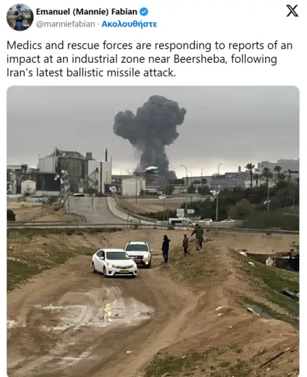Οι ιατρικές υπηρεσίες και οι δυνάμεις διάσωσης ανταποκρίνονται σε αναφορές για πλήγμα σε βιομηχανική ζώνη κοντά στη Μπεερ Σεβά, μετά την τελευταία επίθεση με βαλλιστικούς πυραύλους από το Ιράν.
