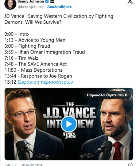 Συγκεκριμένα, ερωτηθείς στο podcast “Benny Show” για την άνοδο των τιμών καυσίμων λόγω του πολέμου, ο Βανς υποστήριξε ότι οι ΗΠΑ έχουν «πετύχει τη συντριπτική πλειονότητα των στρατιωτικών τους στόχων» και εκτίμησε ότι θα μπορούσε κανείς να υποστηρίξει πως οι στόχοι έχουν ήδη επιτευχθεί.