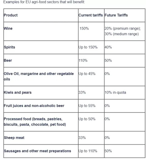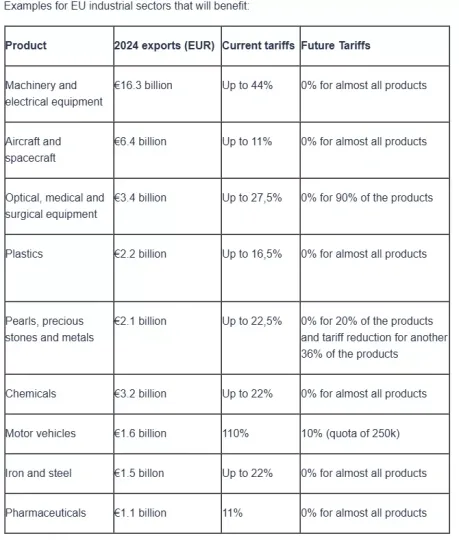 Η συμφωνία καταργεί ή μειώνει τους συχνά απαγορευτικούς δασμούς (πάνω από 36% κατά μέσο όρο) στις εξαγωγές γεωργικών προϊόντων διατροφής της ΕΕ, ανοίγοντας μια τεράστια αγορά για τους Ευρωπαίους αγρότες. Ευαίσθητοι ευρωπαϊκοί γεωργικοί τομείς, όπως το βόειο κρέας, η ζάχαρη ή το ρύζι, δεν θα απελευθερωθούν καθόλου.