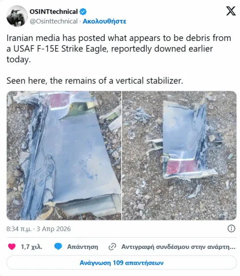 Πάντως, ι εικόνες που δημοσιεύθηκαν από τα ιρανικά μέσα ενημέρωσης φαίνεται να δείχνουν συντρίμμια ενός αμερικανικού μαχητικού αεροσκάφους F-15E και όχι ενός F-35.