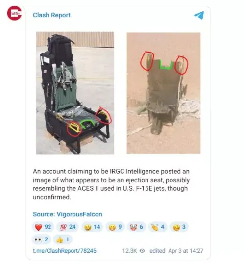 Ένας λογαριασμός που ισχυρίζεται ότι ανήκει στις Υπηρεσίες Πληροφοριών του IRGC δημοσίευσε φωτογραφίες που φαίνεται να δείχνουν ένα εκτινασσόμενο κάθισμα, πιθανώς παρόμοιο με το ACES II που χρησιμοποιείται στα αμερικανικά αεροσκάφη F-15E.