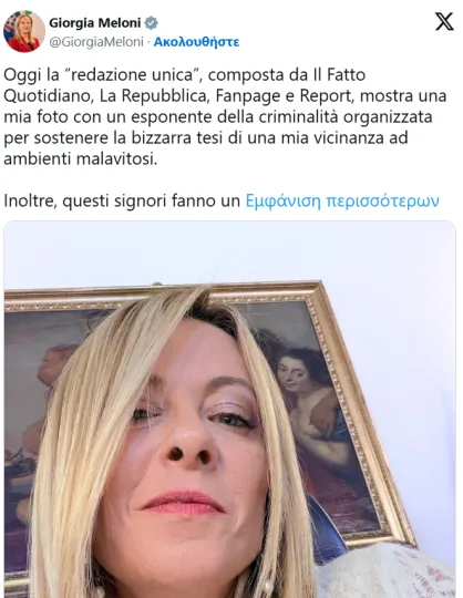 Με αναφορά στα σημερινά δημοσιεύματα, η Ιταλίδα πρωθυπουργός υπογράμμισε: «Οι κύριοι αυτοί ξέρουν καλά ότι, σε δεκαετίες πολιτικής δράσης, υπάρχουν δεκάδες χιλιάδες φωτογραφίες με άτομα που ζητούν απλά μια σέλφι. Και αυτό ισχύει για οποιονδήποτε κάνει πολιτική και βρίσκεται μέσα στον κόσμο».