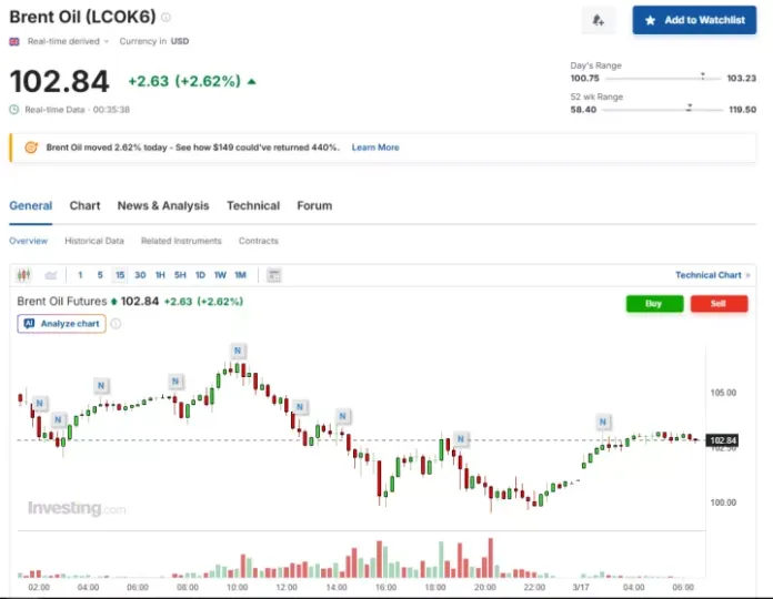 Συγκεκριμένα, λίγο μετά τις 6:35 ώρα Ελλάδας, η τιμή του Brent σημείωνε άνοδο της τάξης του 2,62% στα 102,84 δολάρια το βαρέλι.