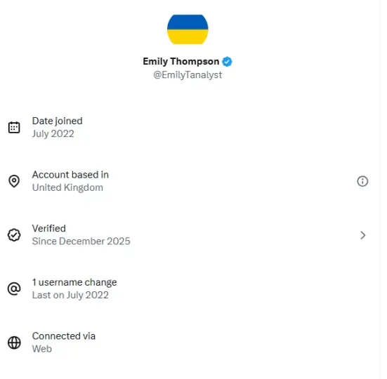 Όπως αναφέρεται σε ενδιαφέρουσα ανάλυση του Sigma Live, πρόκειται για προφίλ με το username @EmilyTanalyst ανήκει σε χρήστη που αυτοπροσδιορίζεται ως Emily Thompson, ανεξάρτητη ερευνήτρια και αναλύτρια, με αντικείμενο την αμερικανική εσωτερική και εξωτερική πολιτική. Το βιογραφικό της αναφέρει χαρακτηριστικά: «Είμαι μια ανεξάρτητη ερευνήτρια, αναλύτρια, και λέκτορας, με κύρια εστίαση στις εσωτερικές και εξωτερικές πολιτικές των ΗΠΑ.»