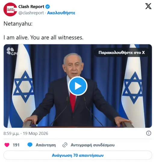 Την δική του απάντηση έδωσε για άλλη μια φορά ο Νετανιάχου στις φήμες ότι έχει πεθάνει, τονίζοντας ότι είναι ζωντανός. «Είμαι ζωντανός, είστε όλοι μάρτυρες για αυτό».