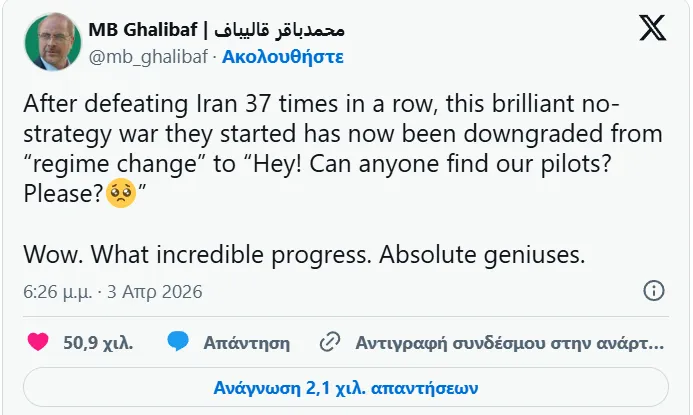 Ο πρόεδρος του Kοινοβουλίου του Ιράν, Μοχάμεντ Μπαγκέρ Γκαλίμπαφ, με ανάρτησή του στο X χλευάζει τις Ηνωμένες Ποιτείες.