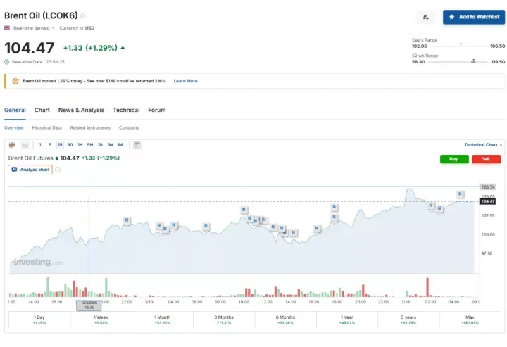 Ειδικότερα, λίγο μετά τις 06:05 ώρα Ελλάδας, τα futures στο πετρέλαιο Brent κατέγραψαν άνοδο 1,29% στα 104,47 δολάρια ανά βαρέλι.