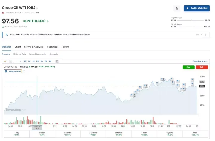 Σε ό,τι αφορά το αμερικανικό αργό πετρέλαιο (WTI) σημείωσε άνοδο 0,74% στα 97,56 δολάρια το βαρέλι.