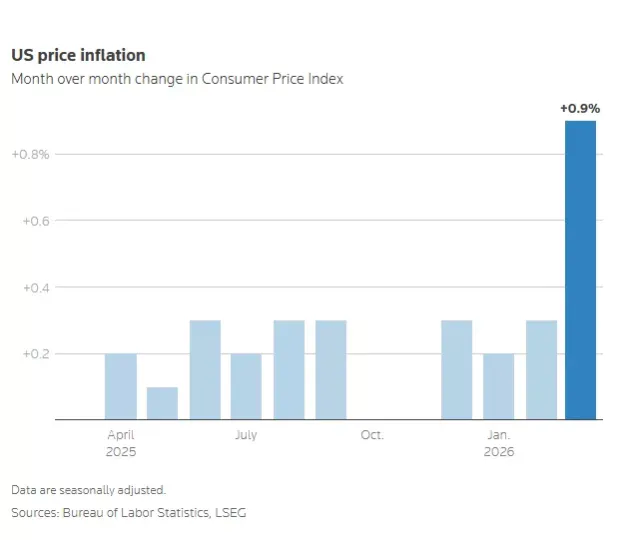 Σε μηνιαία βάση, ο στενά παρακολουθούμενος δείκτης πληθωρισμού του αμερικανικού υπουργείου Εργασίας κατέγραψε άνοδο 0,9%, έναντι 0,3% τον προηγούμενο μήνα. Οι εκτιμήσεις έκαναν λόγο για αύξηση 1,0%.