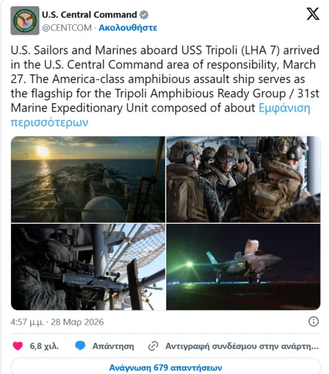 Αμερικανοί ναύτες και πεζοναύτες που επιβαίνουν στο USS Tripoli (LHA 7) έφτασαν στην περιοχή ευθύνης της Κεντρικής Διοίκησης των Ηνωμένων Πολιτειών στις 27 Μαρτίου.
