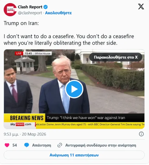Ο Αμερικανός πρόεδρος Τραμπ δήλωσε ότι πιστεύει πως οι ΗΠΑ έχουν «κερδίσει» τον πόλεμο με το Ιράν.