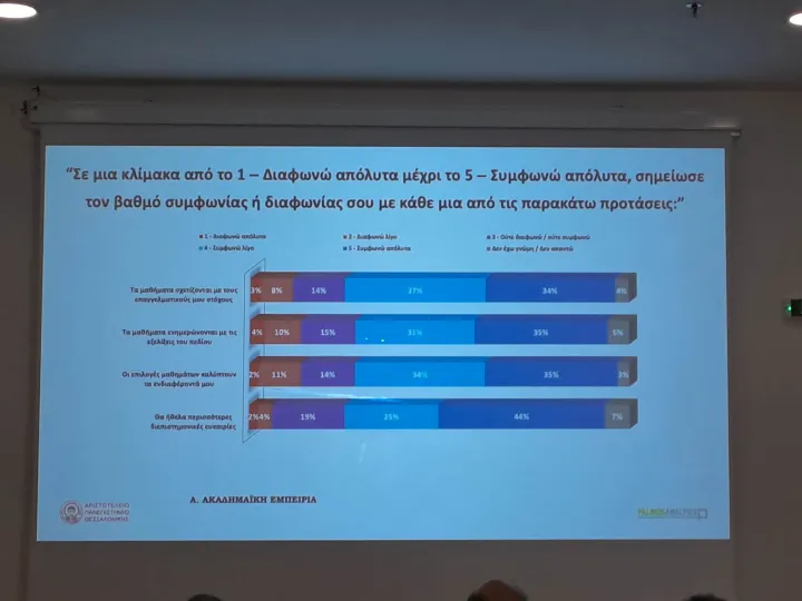 Την ίδια στιγμή, το 71% συμφωνεί λίγο ή απόλυτα στο ότι τα μαθήματα που παρέχονται σχετίζονται με τους επαγγελματικούς του στόχους, ενώ το 69% απάντησε με τον ίδιο τρόπο στο ότι θα ήθελε περισσότερες διεπιστημονικές ευκαιρίες.