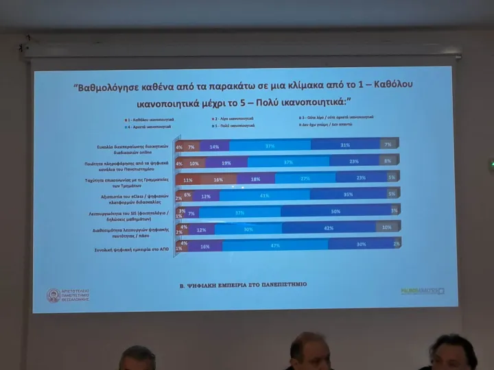 Το 77% των ερωτηθέντων χαρακτηρίζει αρκετά ή πολύ ικανοποιητική τη συνολική ψηφιακή εμπειρία στο ΑΠΘ, ωστόσο το 29% απάντησε ότι είναι καθόλου ή λίγο ικανοποιητική η ταχύτητα επικοινωνίας με τις Γραμματείες των Τμημάτων.