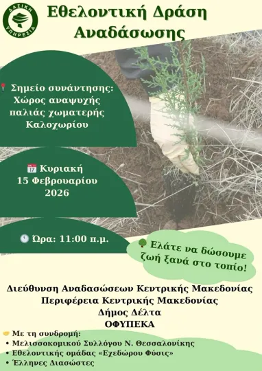 Ανοιχτό κάλεσμα συμμετοχής προς τους πολίτες, για μια παρέμβαση περιβαλλοντικής αποκατάστασης με ιδιαίτερη σημασία για τη δυτική ζώνη της Θεσσαλονίκης, απευθύνει η Διεύθυνση Αναδασώσεων Κεντρικής Μακεδονίας η οποία διοργανώνει εθελοντική δράση αναδάσωσης στην παλιά χωματερή Καλοχωρίου, στον Δήμο Δέλτα, την Κυριακή 15 Φεβρουαρίου 2026, στις 11:00 π.μ.