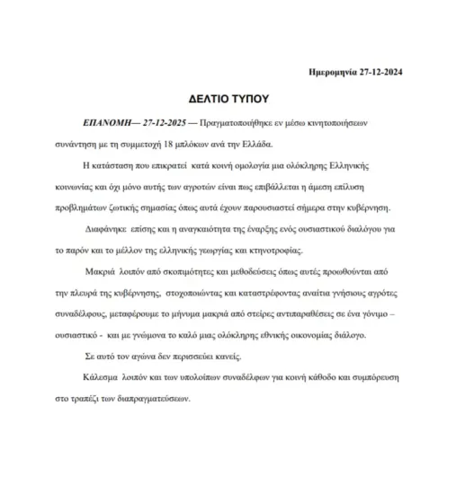 Παράλληλα, τονίζεται η αναγκαιότητα έναρξης ενός ουσιαστικού και γόνιμου διαλόγου με τους συμμετέχοντες να δηλώνουν ότι απορρίπτουν «σκοπιμότητες και μεθοδεύσεις» που, όπως αναφέρουν, προωθούνται από την πλευρά της κυβέρνησης. Στην ανακοίνωση γίνεται λόγος για στοχοποίηση και «αναίτια καταστροφή γνήσιων αγροτών συναδέλφων», ενώ διατυπώνεται η θέση ότι ο διάλογος πρέπει να διεξαχθεί μακριά από στείρες αντιπαραθέσεις και με γνώμονα το συμφέρον της εθνικής οικονομίας.