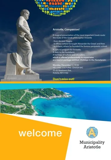 Το πρόγραμμα με τίτλο «Διακοπές στην Πατρίδα», το οποίο το χειμώνα θα φιγουράρει σε ηλεκτρονικούς καταλόγους ταξιδιωτικών γραφείων της αμερικανικής ομογένειας και όχι μόνο, παρουσιάσθηκε (απευθυνόμενο σε κοινό – B2C) στο εμβληματικό Hellenic Cultural Center NYC της Αστόρια, το οποίο παραχωρήθηκε στο Δήμο Αριστοτέλη από την Ελληνική Ορθόδοξη Αρχιεπισκοπή Αμερικής. Η παρουσίαση συνδυάστηκε με τη συνέντευξη του Έλληνα σκηνοθέτη Γιάννη Σμαραγδή - με αφορμή την παγκόσμια πρεμιέρα της νέας του ταινίας «Καποδίστριας» στη Νέα Υόρκη. Την παρακολούθησαν εκπρόσωποι ομογενειακών οργανώσεων της Νέας Υόρκης, ενώ – μεταξύ άλλων – το παρών έδωσαν η Πρόεδρος της Ευρωαμερικανικής Ένωσης Γυναικών Λούλα Λόη-Αλαφογιάννη, ο πανεπιστημιακός Νίκος Αλεξίου από το Queens College, ο άμεσος συνεργάτης του Αρχιεπισκόπου Αμερικής π. Γρηγόριος, ο Διευθυντής του Πολιτιστικού Κέντρου, Αλέξανδρος Αμμοχωστιανός, ο Ελληνοαμερικανός σκηνοθέτης Γιάννης Κουταλής, εκπρόσωποι ελληνικών μέσων ενημέρωσης κ.α.