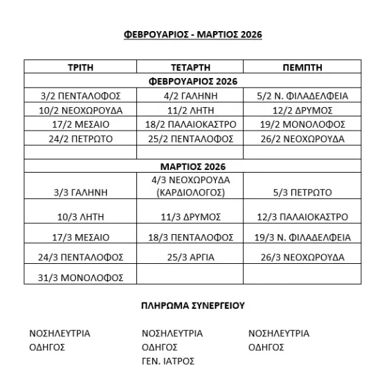 Ακολουθεί το πρόγραμμα επισκέψεων για τους μήνες Φεβρουάριο και Μάρτιο 2026: