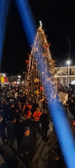 Το πανέμορφο έλατο, ύψους 14m., που κοσμείται από 30.000 λαμπιόνια, πρόβαλε επιβλητικό υπό τους ήχους της Φιλαρμονικής του Δήμου Πολυγύρου, ενώ πλήθος κόσμου κατέκλυσε την πλατεία του χωριού!