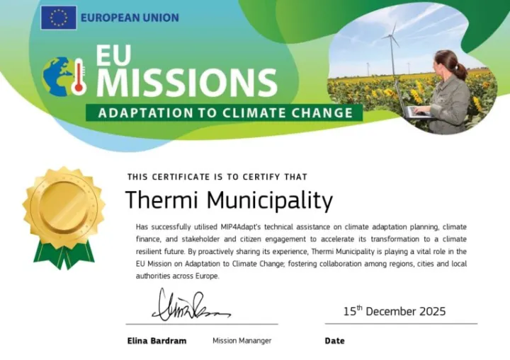 Ο δήμος πιστοποιήθηκε επίσημα από την Ευρωπαϊκή Ένωση για την επιτυχή αξιοποίηση τεχνικής βοήθειας στον τομέα της προσαρμογής στην κλιματική αλλαγή, στο πλαίσιο της EU Mission on Adaptation to Climate Change.