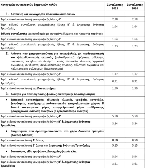 Οι κατηγορίες συντελεστών των δημοτικών τελών: