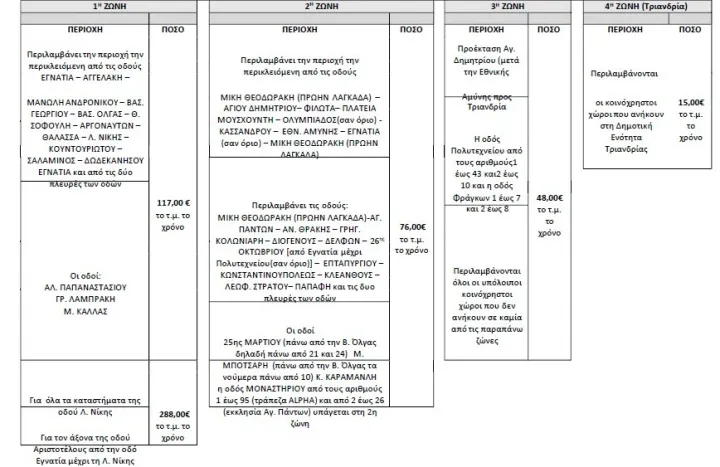 4η ζώνη (Δημοτική Ενότητα Τριανδρίας): Τέλος 15,00 ευρώ/τ.μ. το χρόνο.