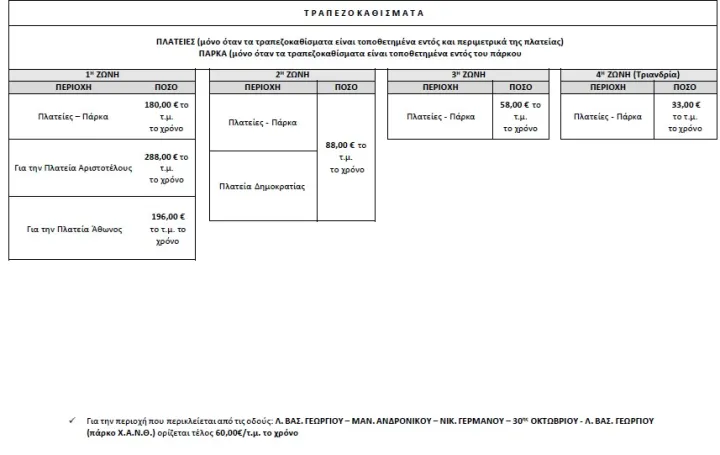 Το τέλος για τη χρήση κοινόχρηστου χώρου για την ανάπτυξη τραπεζοκαθισμάτων καθορίζεται κατά ζώνες, στις οποίες έχουν υπαχθεί οι περιοχές, οι πλατείες και οι δρόμοι.