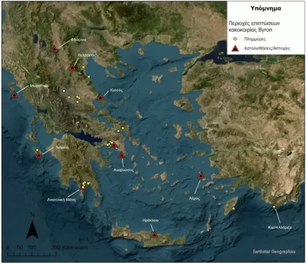 Χάρτης 1. Χάρτης που απεικονίζει τις κύριες θέσεις επιπτώσεων της κακοκαιρίας Byron στο διάστημα 4 έως 7 Δεκεμβρίου 2025. Επισημαίνονται θέσεις αστοχιών πρανών (κατολισθήσεων, βραχοπτώσεων κ.α.)