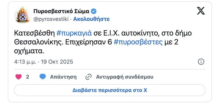 Το περιστατικό συνέβη νωρίτερα σήμερα στην ανατολική Θεσσαλονίκη, στη συμβολή των οδών Σοφούλη και Γ. Παπανδρέου. Η πυρκαγιά είχε ως αποτέλεσμα μόνο υλικές ζημιές.
