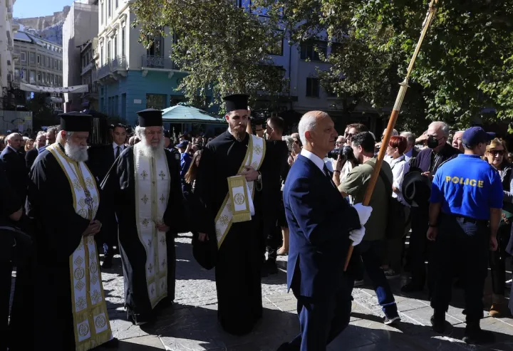 Η σορός του σημαντικού Έλληνα τραγουδοποιού Διονύση Σαββόπουλου μεταφέρθηκε από το κενοτάφιο στη Μητρόπολη Αθηνών για να ξεκινήσει η εξόδιος ακολουθία για την κηδεία του αγαπημένου «Νιόνιου», που θα καταλήξει στο Α' Νεκροταφείο Αθηνών.