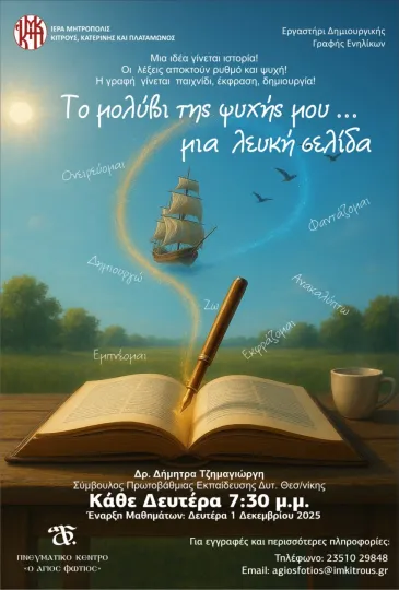 Οι ενδιαφερόμενοι μπορούν να προχωρήσουν την εγγραφή τους και να μάθουν περισσότερες πληροφορίες σχετικά με το Εργαστήρι Δημιουργικής Γραφής της Ιεράς Μητρόπολης Κίτρους, Κατερίνης και Πλαταμώνος στο τηλέφωνο: 23510 29848 και στο email: [email protected].