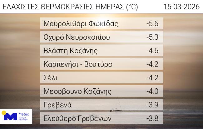 Σύμφωνα με τα στοιχεία του δικτύου αυτόματων μετεωρολογικών σταθμών του Meteo.gr / Εθνικό Αστεροσκοπείο Αθηνών, η χαμηλότερη θερμοκρασία καταγράφηκε στο Μαυρολιθάρι Φωκίδας, όπου ο υδράργυρος έπεσε στους -5,6 °C.