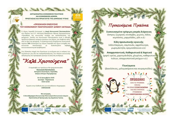 Ο δήμος Λαγκαδά καλεί όλους όσοι μπορούν να προσφέρουν — ακόμη και με τη μικρότερη δυνατή βοήθεια — να στηρίξουν τη δράση, ενισχύοντας το κοινωνικό δίκτυο προστασίας των ευάλωτων συμπολιτών μας.