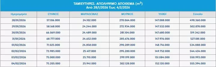 Χαρακτηριστικά είναι στα στοιχεία της ΕΥΔΑΠ που ανανεώνονται σχεδόν καθημερινά στην ιστοσελίδα της. Σημειώνεται, ότι ενώ στις 3 Δεκεμβρίου του 2024, το απολήψιμο απόθεμα στους ταμιευτήρες ήταν 382.310.000 κυβικά μέτρα, δύο μήνες μετά, στις 4 Φεβρουαρίου του 2026, το απόθεμα ανέρχεται στα 555.394.000 κυβικά μέτρα. Άρα, σε αυτό το διάστημα, παρατηρείται μια αύξηση 173.084.000 κυβικών μέτρων.