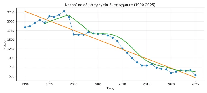 Βλέποντας κανείς τη «μεγάλη εικόνα» και ανατρέχοντας στα αρχεία με τις μακάβριες στατιστικές, τις μαύρες περιόδους της δεκαετίας του 2000 - όταν χάνονταν στην άσφαλτο μέχρι και 2.229 ζωές (1998) - μπορεί να καταλάβει πόσο σημαντικά βήματα έχουν γίνει μέχρι σήμερα στον τομέα της οδικής ασφάλειας. Φυσικά κανείς δεν μπορεί να «πανηγυρίζει» καθώς οι περίπου 525 νεκροί το 2025, παραμένουν ένας «βαρύς φόρος αίματος στην άσφαλτο», μια κλισέ φράση που κατέληξε συνήθεια στον ελληνικό Τύπο για πολλά χρόνια.