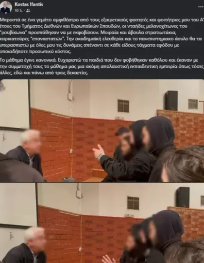 «Μπροστά σε ένα γεμάτο αμφιθέατρο από τους εξαιρετικούς φοιτητές και φοιτήτριες μου του Α' έτους του Τμήματος Διεθνών και Ευρωπαϊκών Σπουδών, οι νταήδες μελανοχίτωνες του "ρουβίκωνα" προσπάθησαν να με εκφοβίσουν. Μοιραία και άβουλα στρατιωτάκια, καρικατούρες "επαναστατών".