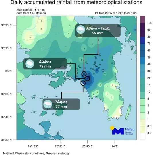 Σύμφωνα με δίκτυο αυτόματων μετεωρολογικών σταθμών του Εθνικού Αστεροσκοπείου Αθηνών/Meteo.gr μεγάλα ύψη βροχής καταγράφηκαν στα δυτικά ηπειρωτικά και στην Αττική, όπως αποτυπώνεται σε σχετικό χάρτη με το μεγαλύτερο ύψος βροχής μέχρι και τις 17:20 ώρα Ελλάδας να καταγράφεται στη Δάφνη Αττικής με 78 mm.