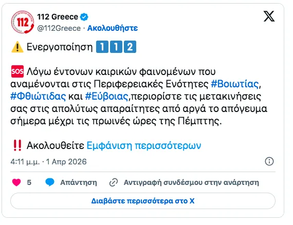 Συγκεκριμένα το μήνυμα αναφέρει: «Λόγω έντονων καιρικών φαινομένων που αναμένονται στις Περιφερειακές Ενότητες Βοιωτίας, Φθιώτιδας και Εύβοιας, περιορίστε τις μετακινήσεις σας στις απολύτως απαραίτητες από αργά το απόγευμα σήμερα μέχρι τις πρωινές ώρες της Πέμπτης. Ακολουθείτε τις οδηγίες των Αρχών».