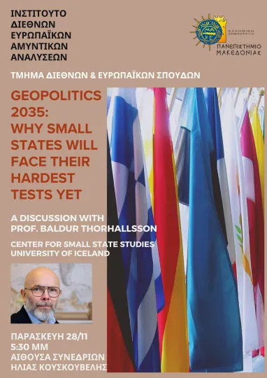 Σε μία ανοιχτή συζήτηση με θέμα: Geopolitics 2035: Why Small States Will Face Their Hardest Tests Yet ο Ισλανδός Καθηγητής θα συζητήσει τις αλλαγές στο περιβάλλον ασφάλειας και τις προκλήσεις που καλούνται να αντιμετωπίσουν τα επόμενα χρόνια τα μικρά κράτη, καθώς δίκτυα ασφαλείας, διεθνείς οργανισμοί και πολυμερείς συμμαχίες αποδυναμώνονται, ενώ οι απειλές διαφοροποιούνται και πολλαπλασιάζονται.