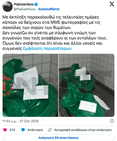 «Με έκπληξη παρακολουθώ τις τελευταίες ημέρες κάποιοι να δείχνουν στα ΜΜΕ φωτογραφίες με τις σακούλες των σορών των θυμάτων. Δεν γνωρίζω αν γίνεται με σύμφωνη γνώμη των συγγενών που τους αναφέρουν ή των εντολέων τους. Όμως δεν σκέφτονται ότι είναι και άλλοι γονείς και συγγενείς που προσπαθούν να διαχειριστούν όλο αυτό;», γράφει σε ανάρτησή του ο κ. Πλακιάς.